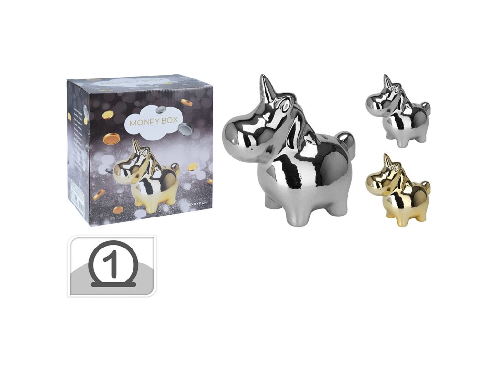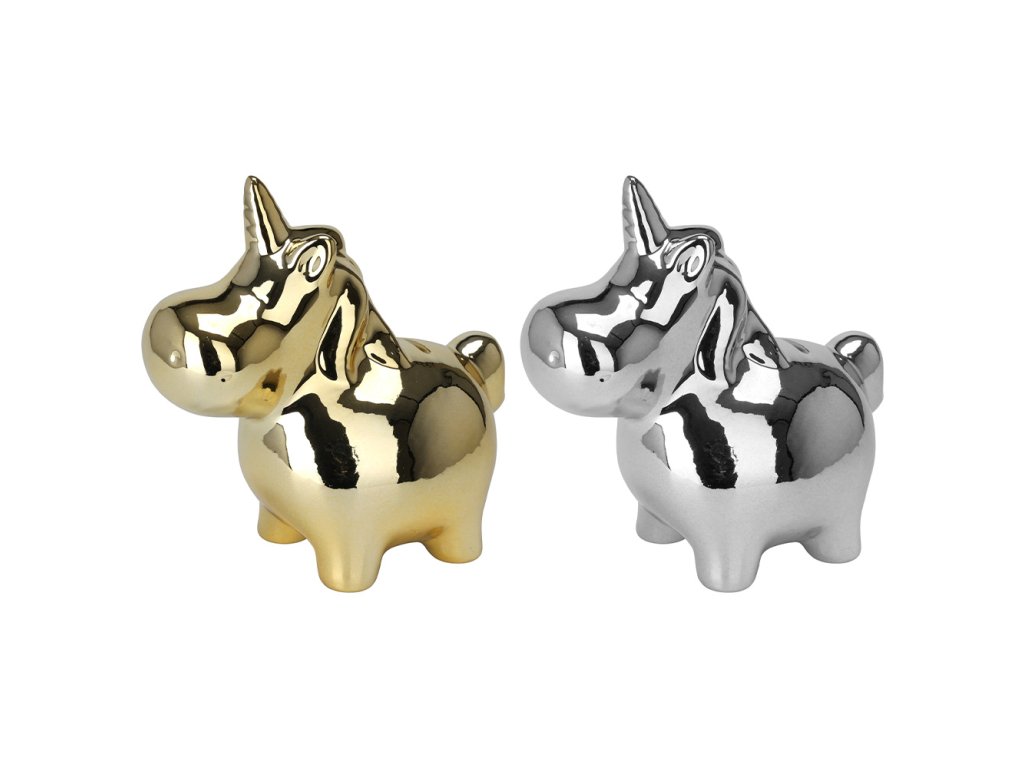 Pokladnička s roztomilým motivem zvířátka ve stříbrné nebo zlaté barvě.