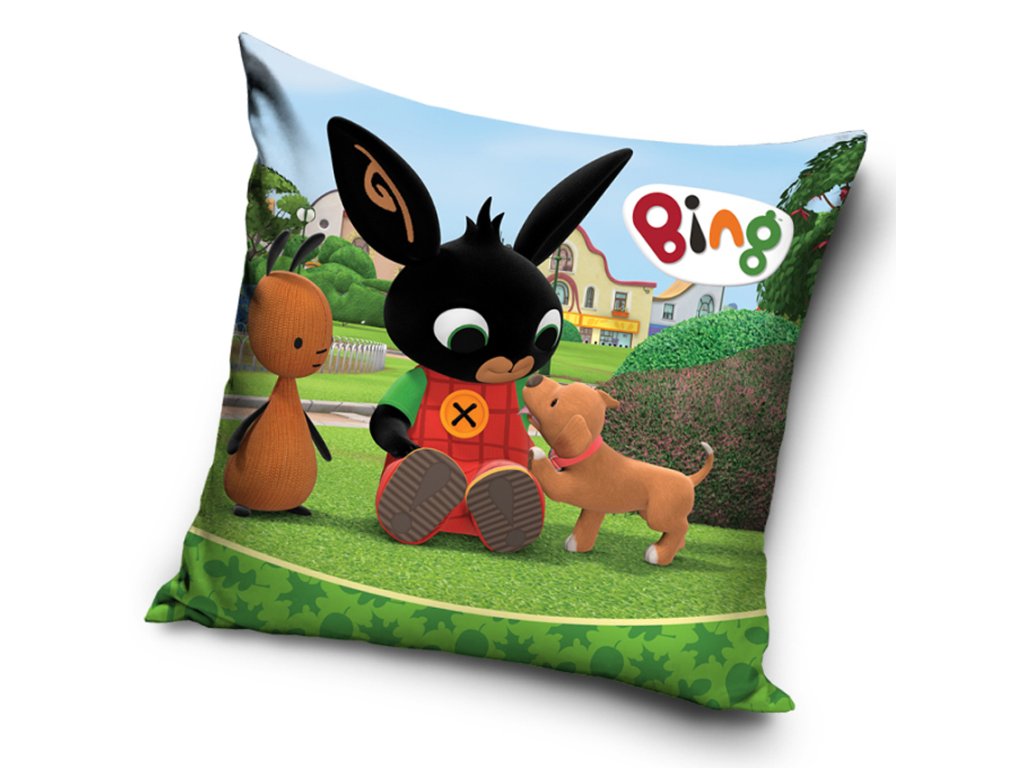 Na polštářku je veselý motiv z oblíbeného dětského seriálu Zajíček Bing, který zachycuje Binga při hře s roztomilým štěňátkem