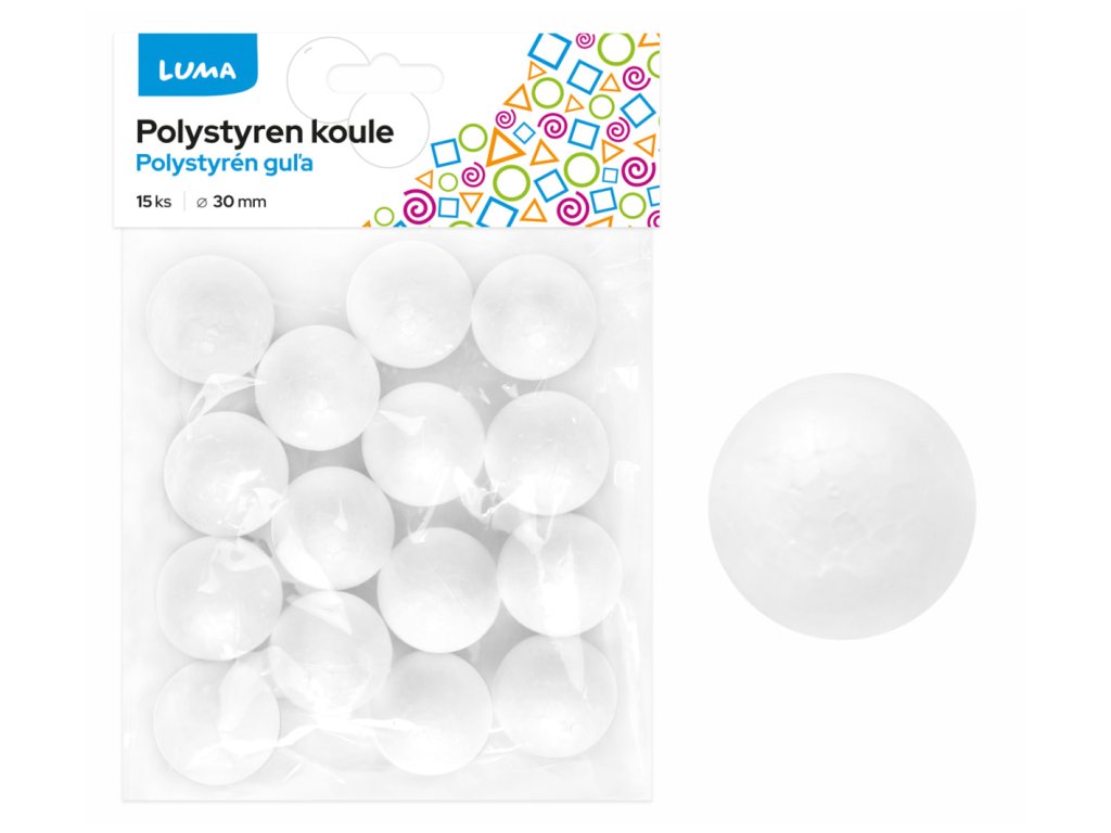 Polystyren - Koule 30mm- polystyrenová koule- vhodná k sezónním dekoracím, aranžování- koule lze různě dekorovat, pomalovat, polepit- rozměr: 30mmDoplňkové parametry