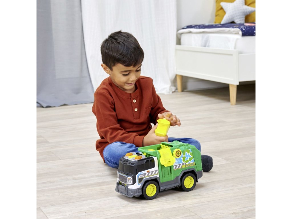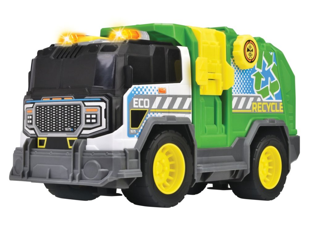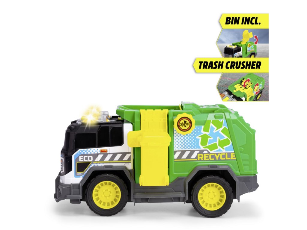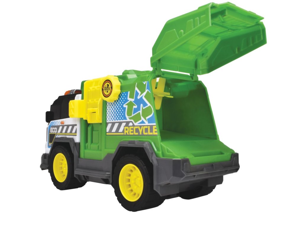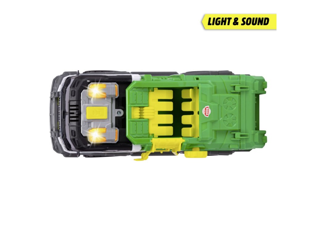 Popelářské auto zelené na volnoběh, s manuální funkcí zvedání popelnice. Zvukové a světelné efekty, otevírací zadní panel. Popelnice součástí. Délka 30 cm.Doplňkové parametry