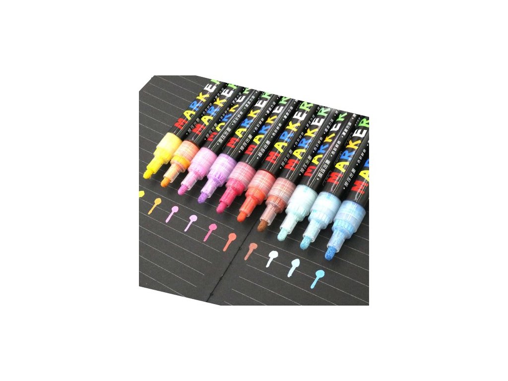 Dekorativní popisovač akrylový Šířka hrotu 2 mm Vhodný pro malování na kámen, sklo, dřevo, kov, plast, atd. Rychleschnoucí inkoust, který na světlém i tmavém povrchu vytvoří odolný a lesklý povrch Odolný vůči vodě a otěruDoplňkové parametry