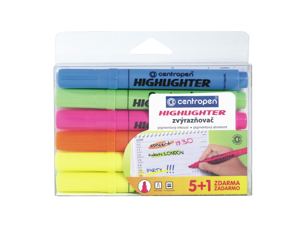 Zvýrazňovač 8552/5+1. Základní barvy žlutá 2x, modrá, oranžová , růžová, zelená. Velkokapacitní zvýrazňovač , fluorescenční pigmentový inkoust vhodný na všechny druhy papíru. Klínový hrot , šířka stopy 1-4,6 mm.Doplňkové parametry