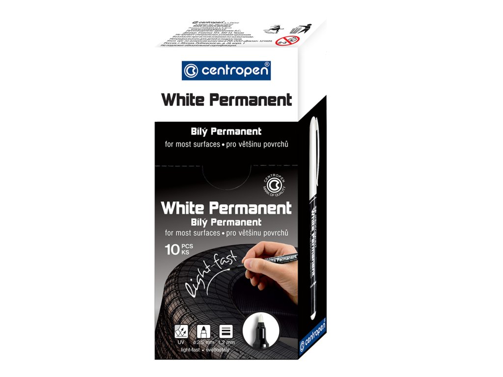Univerzální permanentní popisovač určený pro hobby a průmysl. Bílý inkoust na vodní bázi, píše na povrchy většiny materiálů. Po dokonalém zaschnutí (cca 3 hod) stopa odolává vodě a oděru. Válcový hrot, šířka stopy 1,2 mm. Skladovat ve vodorovné poloze.Doplňkové parametry