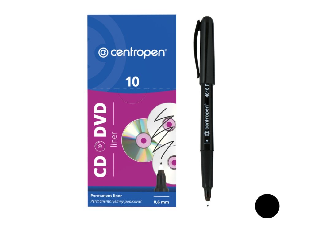 Popisovač CENTROPEN 4616 CD liner černý- speciální liner v novém designu s ergonomickou úchopovou zónou určený především k popisování CD, DVD, BD disků- jemná stopa písma, permanentní inkoust na alkoholové bázi- stopu lze odstranit lihem- z disků šetrně stírat od středu k okrajům- ventilační chránítko, po použití uzavřít- barva: černá- šířka stopy: 0,6mm- jemný plastový hrotDoplňkové parametry