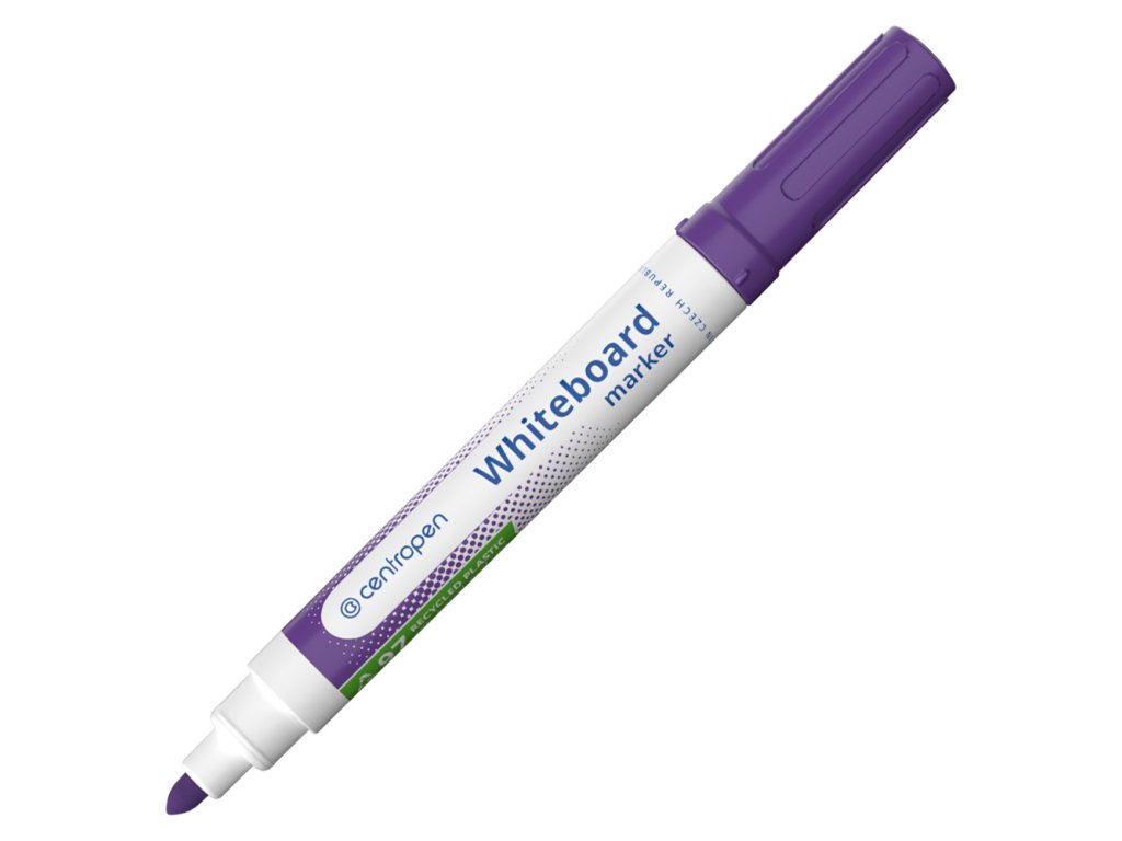 Stíratelný značkovač na bílé smaltované tabule, PVC, sklo, porcelán. Inkoust je za sucha stíratelný, světlostálý, Náplň je zdravotně neškodlivá, valcový hrot s průměrem 5 mm, šírka stopy 2,5 mm. Skladujte ve vodorovné poloze. Barva fialová.Doplňkové parametry