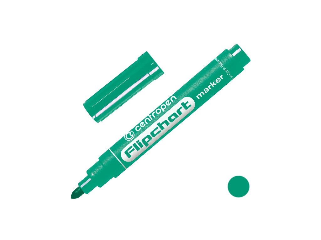 Popisovač Centropen 8550 zelené barvy. Značkovač určený na psaní na papír, zvláště vhodný pro papírové listové tabule - FLIPCHART. Na vodní bázi, nepropíjí papír. Válcový hrot s šířkou stopy 2,5 mm.Doplňkové parametry