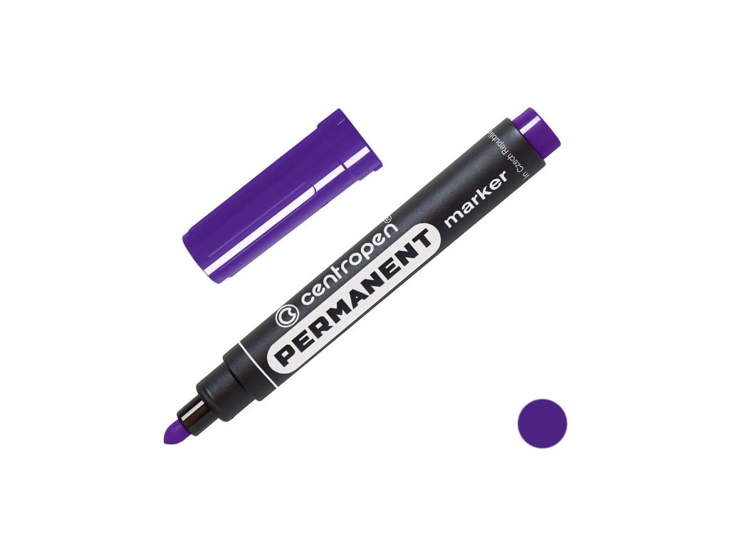 Permanentní popisovač Centropen 8566 fialové barvy. Je určený k psaní na papír, pryž, plast, beton, kámen, dřevo, film, fólie, kov, sklo a porcelán. Válcový hrot s šířkou stopy 2,5mm. Otěruvzdorný inkous je na alkoholové bázi. Odolný proti vodě a povětrnostním vlivům.Doplňkové parametry