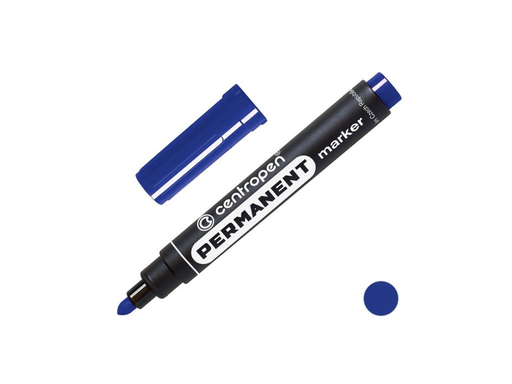 Permanentní popisovač Centropen 8566 modré barvy. Je určený k psaní na papír, pryž, plast, beton, kámen, dřevo, film, fólie, kov, sklo a porcelán. Válcový hrot s šířkou stopy 2,5mm. Otěruvzdorný inkous je na alkoholové bázi. Odolný proti vodě a povětrnostním vlivům.Doplňkové parametry