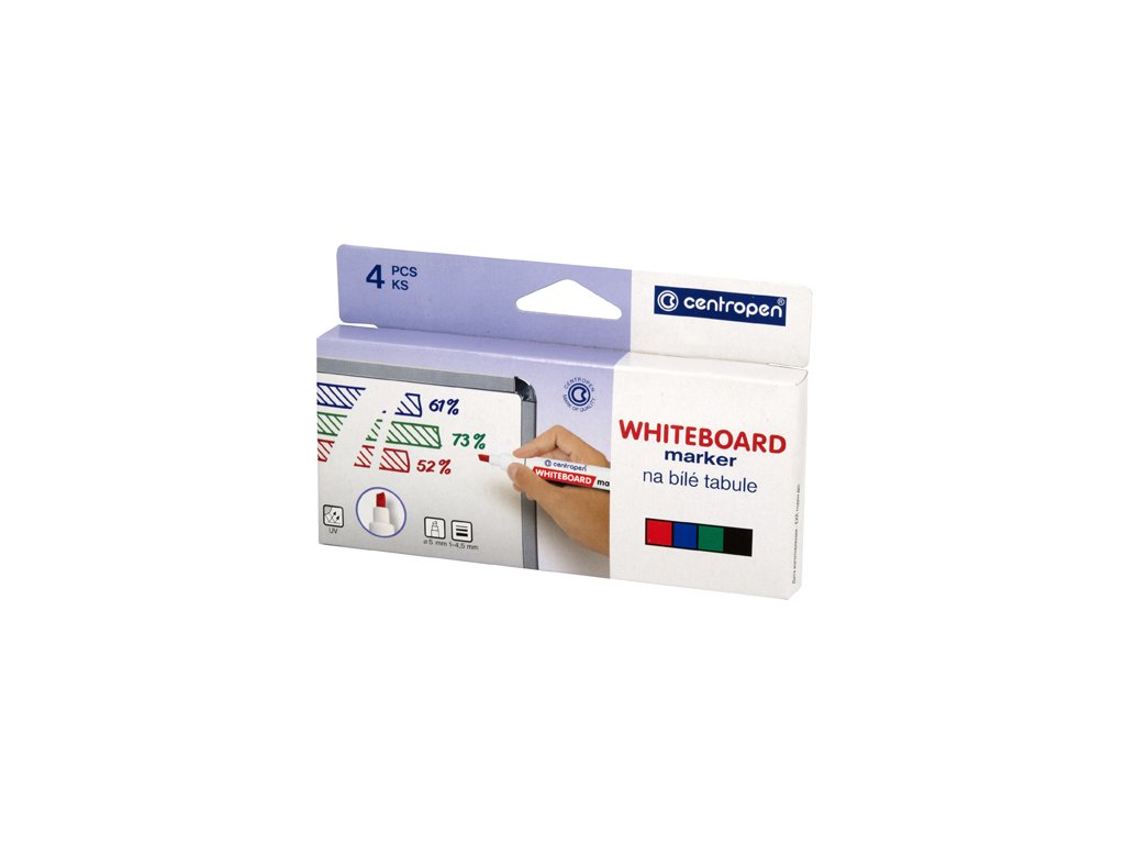 Sada popisovačů na bílé smaltované tabule a na neporézní povrchy. Stíratelný za sucha, světlostálý, inkoust na lihové bázi. Klínový hrot, průměr 5 mm. Šíře stopy 1-4,5 mm. Sada obsahuje 4 ks: červená, modrá, zelená a černá barva.Doplňkové parametry