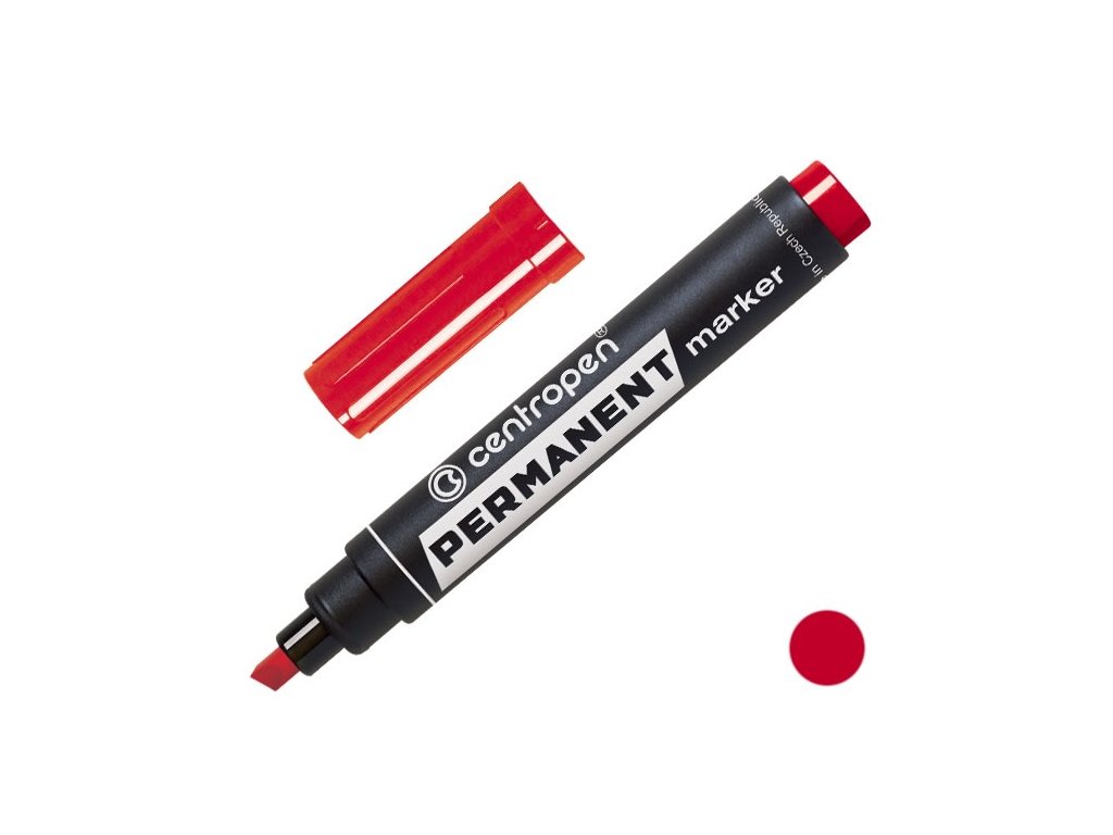Permanentní popisovač Centropen 8576 červené barvy. Vhodný k psaní na papír, kůže, pryž, plast, beton, kámen, dřevo, film, fólie, kov, sklo, porcelán. Klínový hrot s šířkou stopy 1 - 4,6mm. Otěruvzdorný inkoust na alkoholové bázi, odolný vodě a povětrnostním vlivům. Ventilační chránítko.Doplňkové parametry