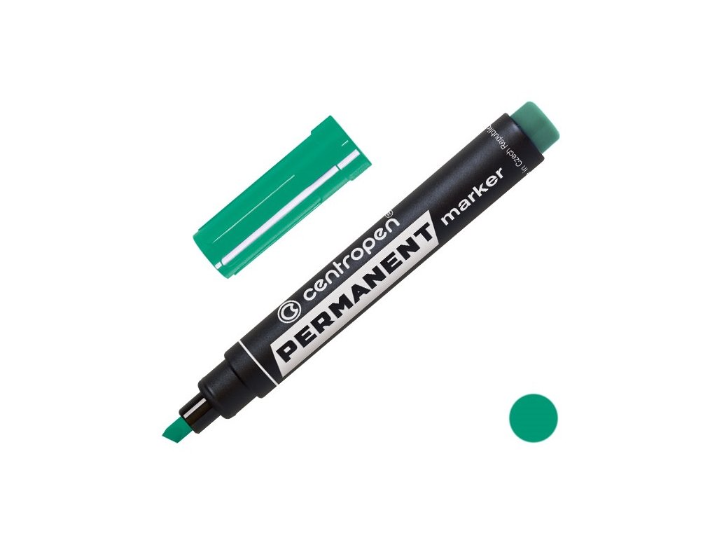 Permanentní popisovač Centropen 8576 zelené barvy. Vhodný k psaní na papír, kůže, pryž, plast, beton, kámen, dřevo, film, fólie, kov, sklo, porcelán. Klínový hrot s šířkou stopy 1 - 4,6mm. Otěruvzdorný inkoust na alkoholové bázi, odolný vodě a povětrnostním vlivům. Ventilační chránítko.Doplňkové parametry