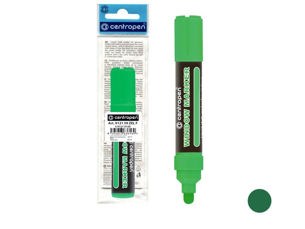 Popisovač CENTROPEN 9121 zelený KŘÍDOVÝ- speciální značkovač s přepouštěcím mechanismem- tekutá křída na vodní bázi- vhodný na neporézní povrchy (okna, zrcadla, výlohy,...)- silné krycí schopnosti- světlostálý inkoust- stíratelný- před použitím dobře protřepejte a několikrát zatlačte na hrot, dokud se nenasytí barvou- začne-li stopa písma slábnout, proveďte dosycení krátkým zatlačením hrotu- válcový hrot- šířka stopy: 3-4mm- barva: zelenáDoplňkové parametry