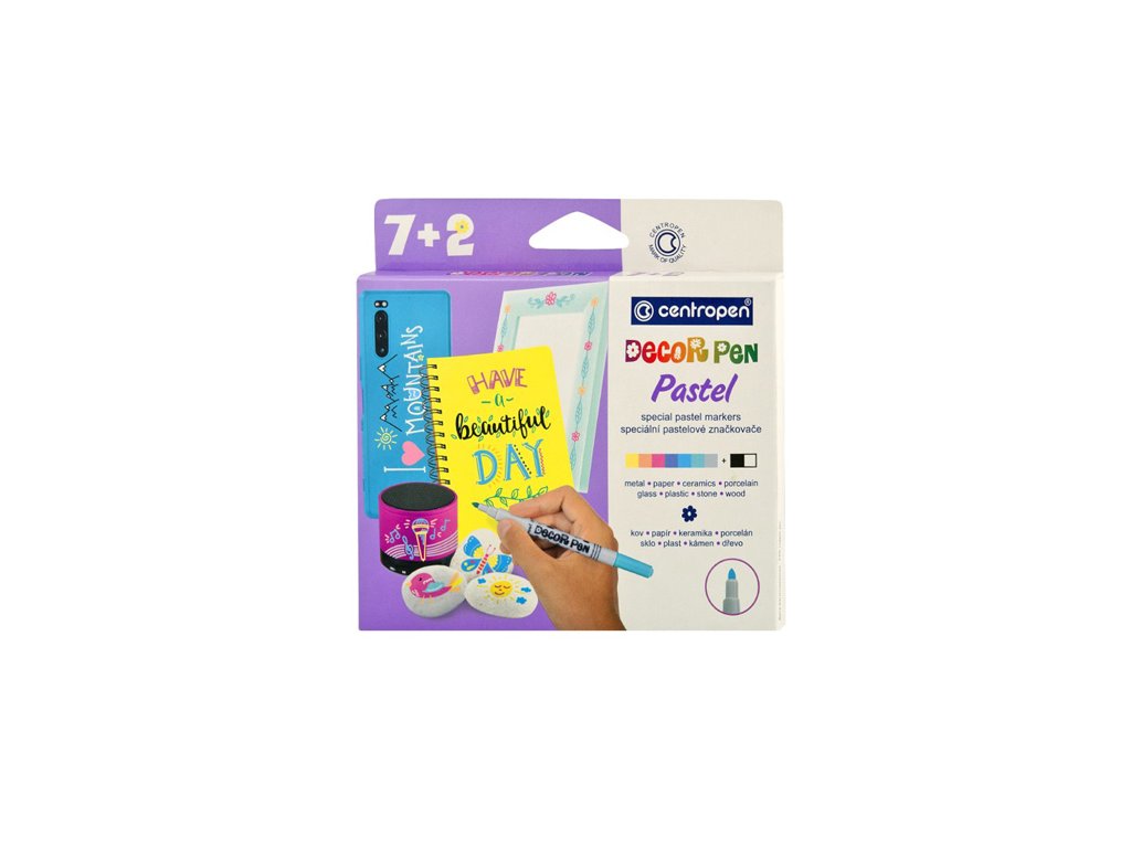 Hledáte fixy na kameny, kov, sklo, keramiku nebo zdobení vajíček? Dekorační fixy pastel Centropen Decor Pen 2738 obsahuje 7 pastelových odstínů + 1 ??bílý a 1 černý popisovač. Je určen k dekoraci různých materiálů jako jsou lakový papír, kov, sklo, fólie, keramika, kraslice, kameny. Má světlostálý pigmentový inkoust na vodní bázi. Stopa písma je výrazně sytá, permanentní, světlostálá. Po dokonalém zaschnutí min. 4 hod. se stopa stává odolnou vůči otěru a na porézních površích i vodě.Doplňkové parametry