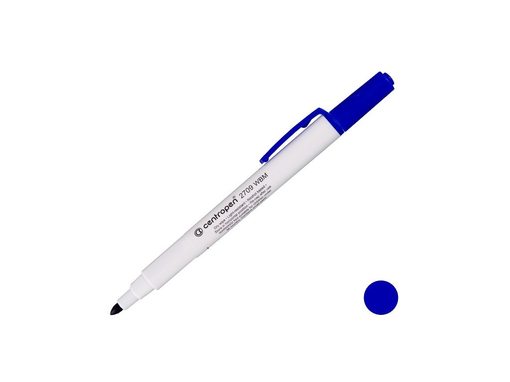 Popisovač Centropen 2709 modrý, stíratelný. Značkovač na bílé stíratelné tabule. Válcový hrot s šířkou stopy 1,8 mm. Ergo úchopové držení. Vhodný i na film, fólie, kov, plast, pryž, sklo, porcelán. Za sucha stíratelný, permanentní, světlostálý inkoust. Inkoust je na alkoholové bázi, zdravotně nezávadný, bez zápachu.Doplňkové parametry