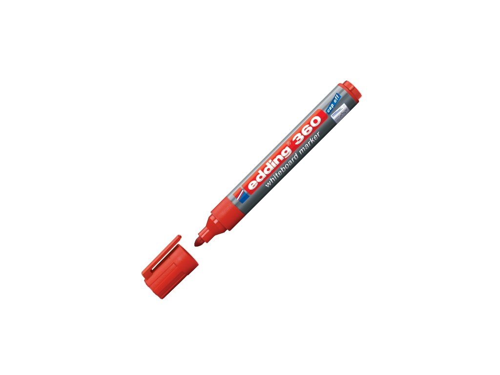 Popisovač na bílé tabule - Edding 360 červený s kulatým psacím hrotem střední tloušťky. Za sucha stíratelný z neporózních povrchů. Bez uzávěru nevyschne po dobu několika dní. Opětovně naplnitelný inkoustem edding BTK 25. Vyměnitelné psací hroty. Šíře stopy: 1,5-3 mDoplňkové parametry