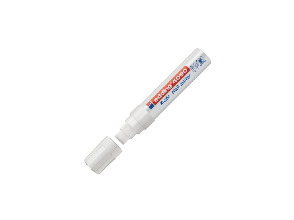 Popisovač na sklo a tabule světlé barvy. Seříznutý psací hrot s širokou stopou písma. Plněný tekutou křídou na bázi vody. Za sucha smazatelný z neporózních povrchů vlhkou utěrkou. Syté, zářivé barvy. Šíře stopy: 4-15 mm. Barva: bílá.Doplňkové parametry