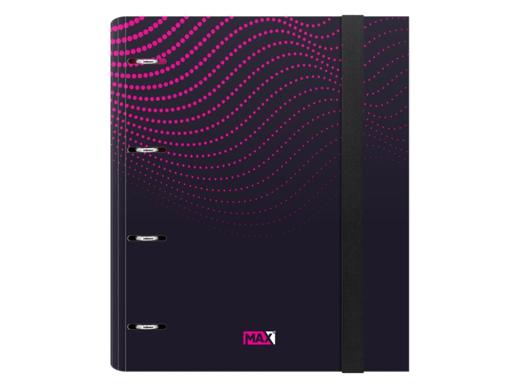 Exklusivní 4-kroužkový pořadač formátu A4 s gumou Rozměry 318 x 280 mm Černý s růžovým potiskem. Vnitřní strana v barvě potisku Pískový plastový povrch Šířka 3,7 cmDoplňkové parametry