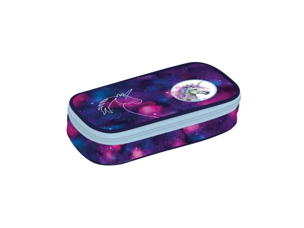 Školní pouzdro má pevné zipy, uzavíratelnou kapsu na zip, přihrádku na pravítko a klopu se šesti poutky pro psací potřeby.
