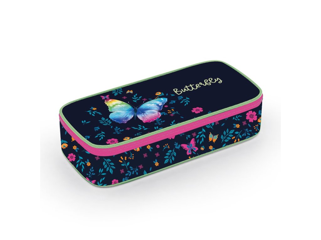 Školní pouzdro etue je vybaveno pevnými zipy, kapsou na zip a klopou s pevnými poutky po obou stranách.