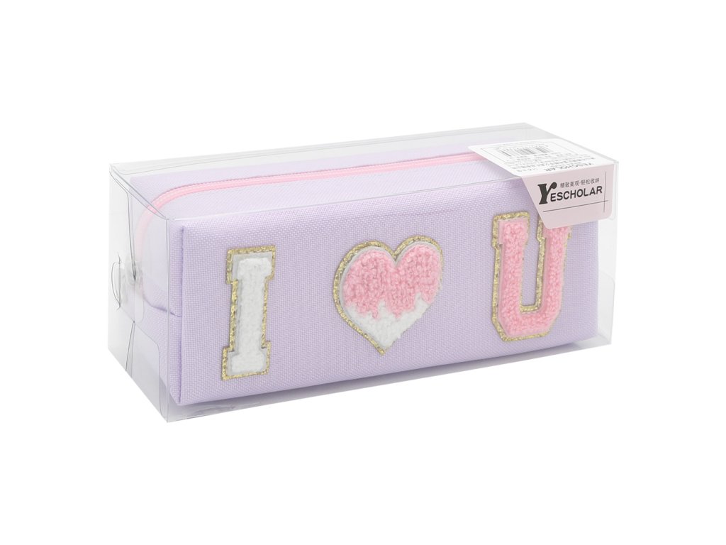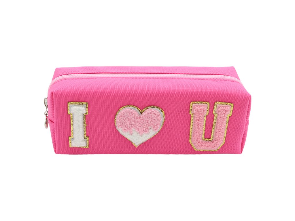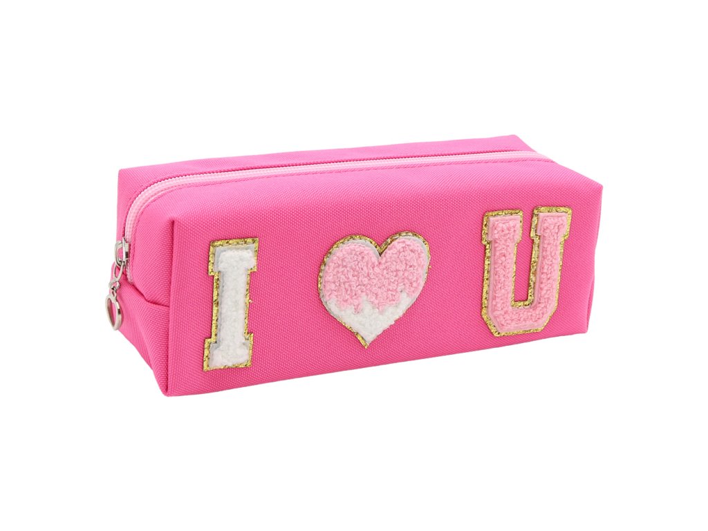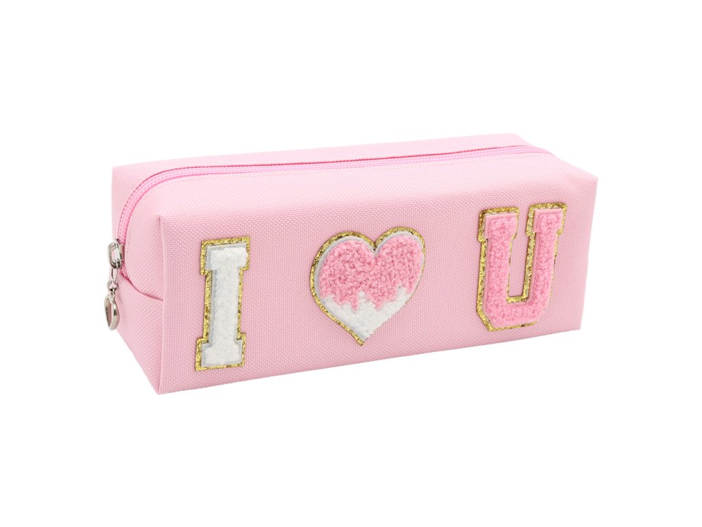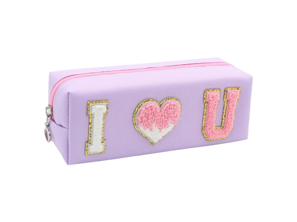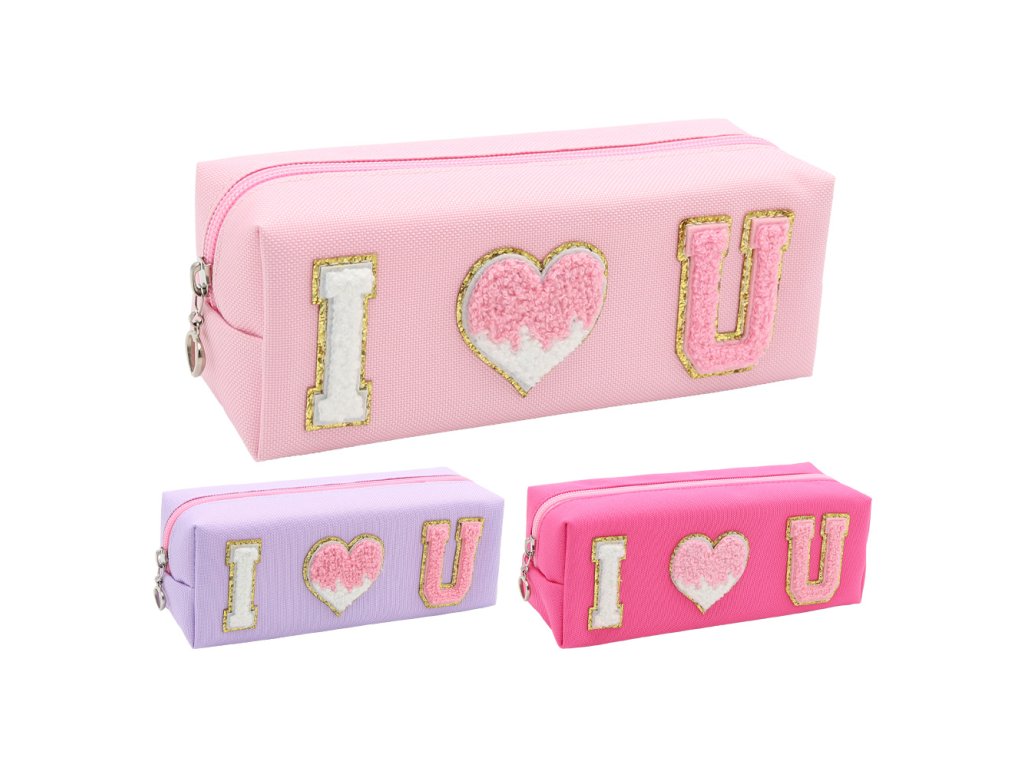 Lehoučké pouzdro s 3D nápisem "I love you" se třpytivým lemováním ve zlaté barvě, určené pro volně ložené školní potřeby (Fialové, Světle-růžové, Tmavě-růžové).