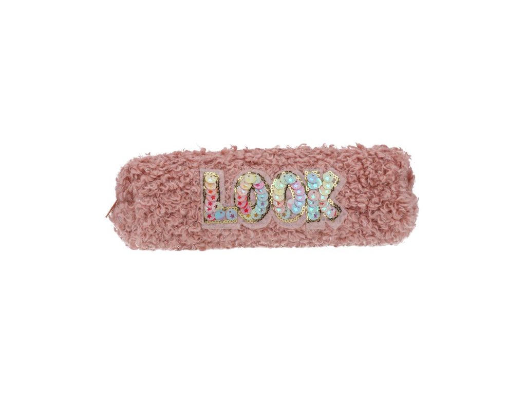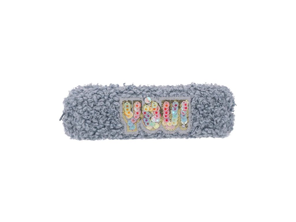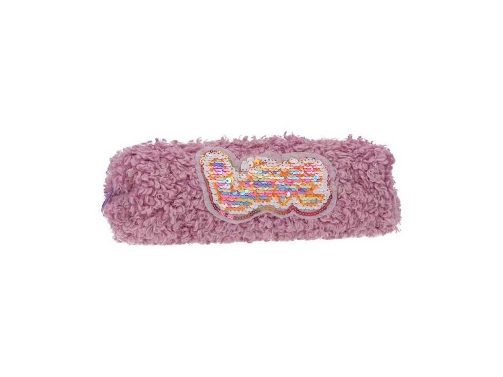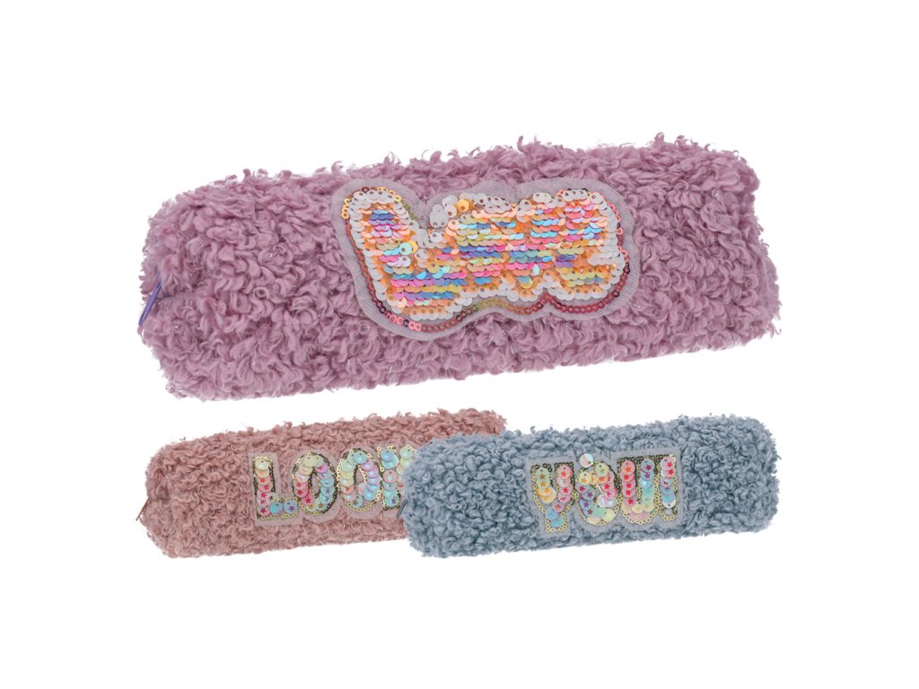 Chlupaté pouzdro na psací potřeby s třpytivým nápisem ve 3 barvách.
