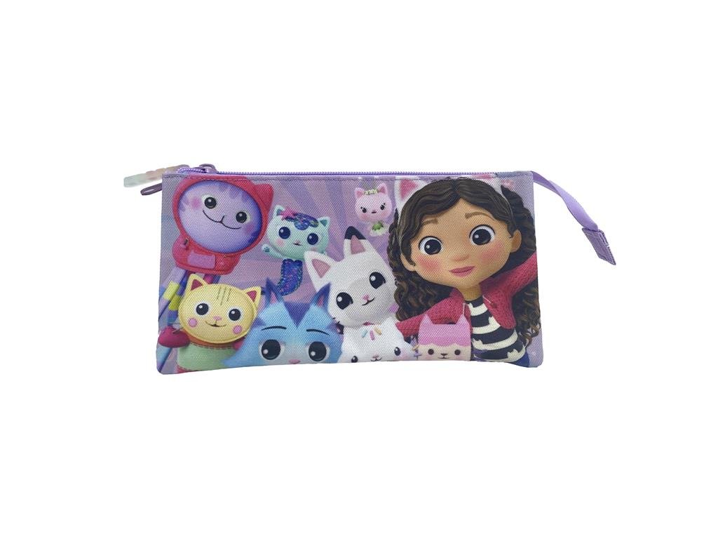 Krásné trojité pouzdro s designem z oblíbeného seriálu Gábinin kouzelný domek Rozkošné kočky, zvědavá řemesla a dotek magie. Mladá milovnice koček a její nerozlučná Pandy Patitas se ve svém animovaném světě skvěle baví. Velmi odolné kovové zipy a gumový přívěšek se siluetou šesti koťátek. Má tři velké přihrádky a dvě menší, ve kterých můžete nosit drobné příslušenství.Doplňkové parametry
