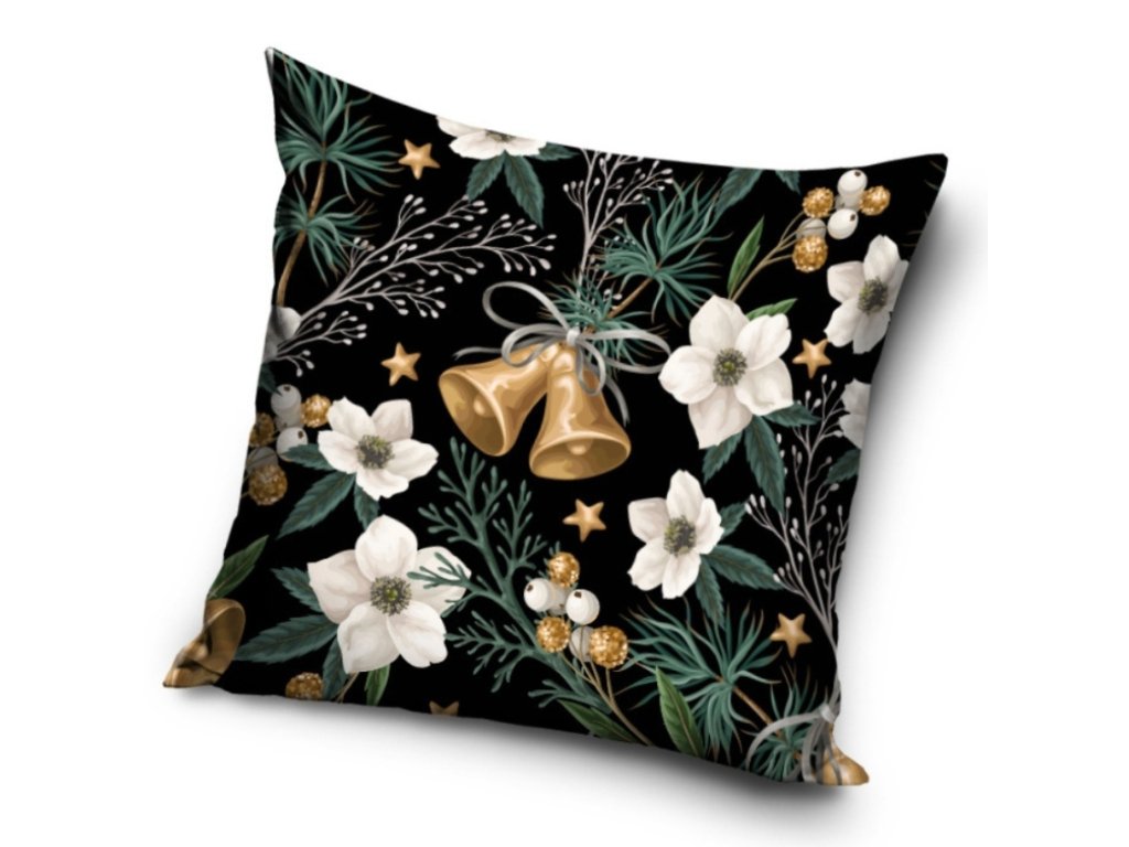 Na černém povláčku jsou bílé květinky které doplňují zelené větvičky a zlaté zvonečky