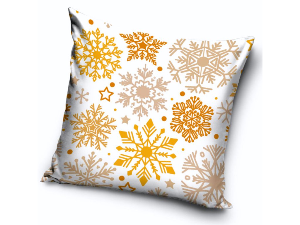 Povlak zdobí elegantní motiv zlatých a béžových sněhových vloček, které jsou rozprostřeny po sněhově bílém podkladu