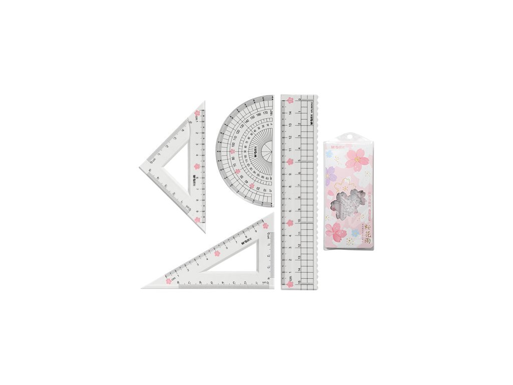 Sada 4 pravítek z kolekce Sakura. Obsah: Úhloměr, 15 cm pravítko, 2 x trojúhelníkové pravítko (10 cm). Sada je v uzavíratelném obalu.Doplňkové parametry