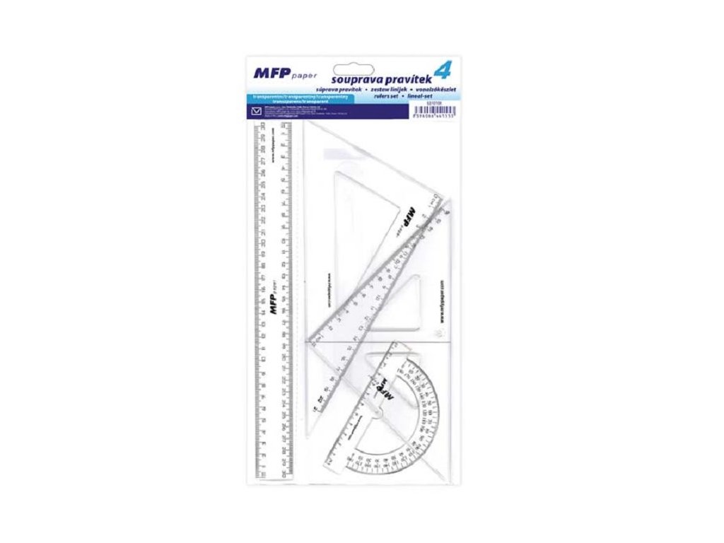 Set 4 ks rýsovacích potřeb. - pomocník při geometrii BALENÍ OBSAHUJE: - pravoúhlý trojúhelník o délce 16 cm s ryskou - rovné pravítko o délce 30 cm - trojúhelník 90°/30°/60° - úhloměr Barva: transparentní Pravítko je zdravotně nezávadné a neobsahuje ftaláty. Uvedená cena je za celý set 4 druhů pravítek. Dodáváme v plastovém balení se závěsem.Doplňkové parametry