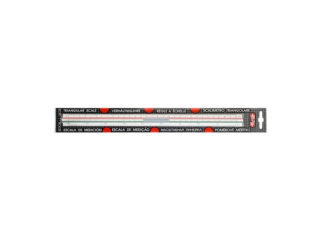 Trojboké poměrové měřítko délky 300 mm je vyrobené z bílého polystyrenu. Na hranách jsou technologií horké ražby naraženy stupnice o poměrech 2:1, 1:1, 1:2, 1:2,5, 1:5, 1:15. Přesnost stupnic 0,2% délky. Pro rychlé rozlišení při práci jsou jednotlivé boky označeny pruhem žluté, zelené a červené barvy. Tím je poměrové měřítko předurčeno hlavně pro použití ve strojařských profesích. Zabaleno je do čiré průhledné polyetylénové etue s papírovou vložkou a eurozávěsem.Doplňkové parametry
