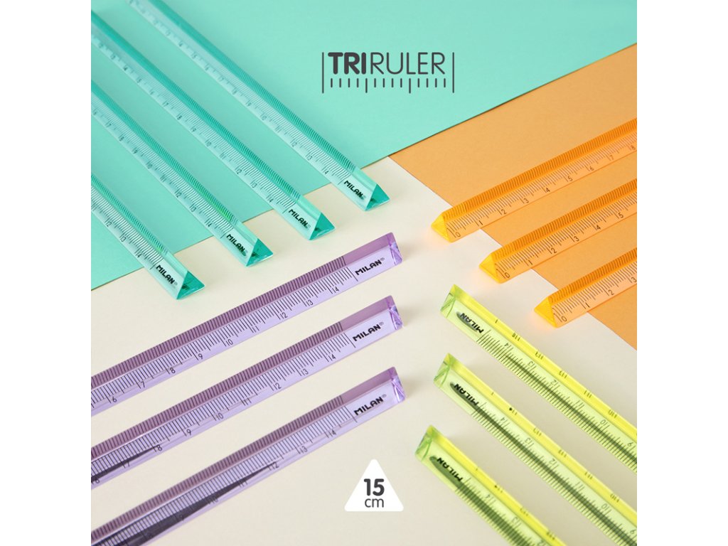 15 cm trojuholníkové transparentné pevné plastové pravítka. Priesvitné farby: žltá, oranžová, zelená a fialová. Séria New Look. Obsahuje 15 jednotiek z každej farby.Doplňkové parametry