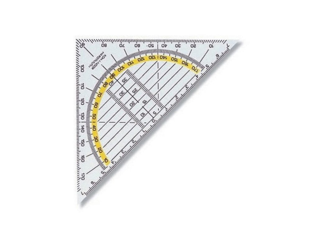 Trojúeolník s uhloměrem, s pravítkem na pravé odvesně, vyrobený z transparentního PVC.Doplňkové parametry