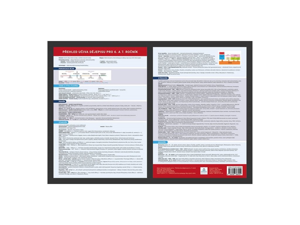Přehledně zpracované učivo dějepisu 6. a 7. ročníku pro snadné zapamatování základní výkladové látky. Karta obsahuje témata: Pravěk, Starověk, Středověk a Novověk.Přehledová tabulka slouží především pro žáky druhého stupně základní školy.Doplňkové parametry