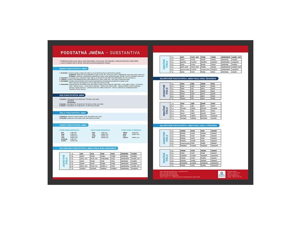 Přehledně zpracovaný přehled učiva pedagogy podle potřeby žáků. Přehledová tabulka – Podstatná jména – ucelený přehled o podstatných jménech, druhy podstatných jmen, příklady a skloňování podstatných jmen. Přehledová tabulka slouží pro žáky prvního a druhého stupně. Přehledová tabulka je pomocníkem pro žáky se speciálními vzdělávacími potřebami. Tabulka je vhodná pro žáky připravující se na víceletá gymnáziaDoplňkové parametry