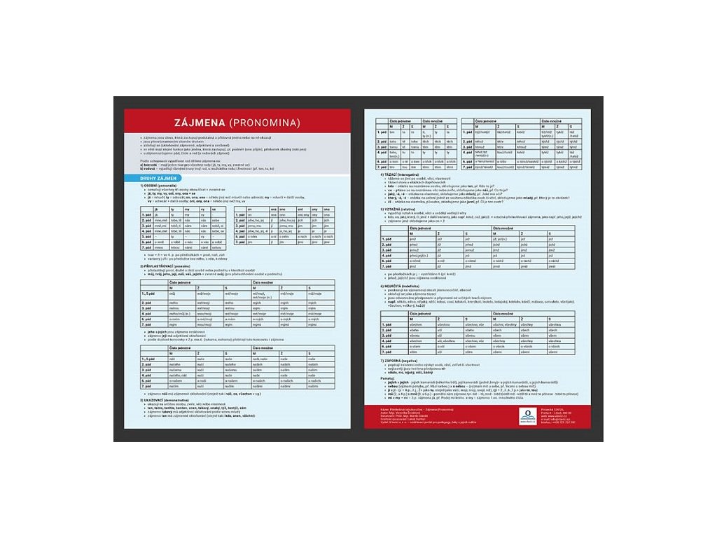 Přehledová tabulka – Zájmena – ucelený přehled gramatiky zájmen, druhy zájmen a jejich příklady, pravidla pro používání zájmen, skloňování zájmen. Přehledová tabulka slouží pro žáky prvního a druhého stupně. Tabulka je pomocníkem pro žáky se speciálními vzdělávacími potřebami.Doplňkové parametry