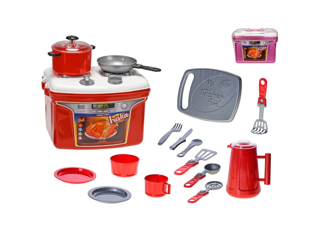 Přenosný kuchyňský set Iriska - sporák s nádobím D: 28cm x Š: 19,5cm x V: 21cm Věk: 3+ Barvy: červená, růžová Požadovanou barvu prosím uveďte do poznámkyDoplňkové parametry