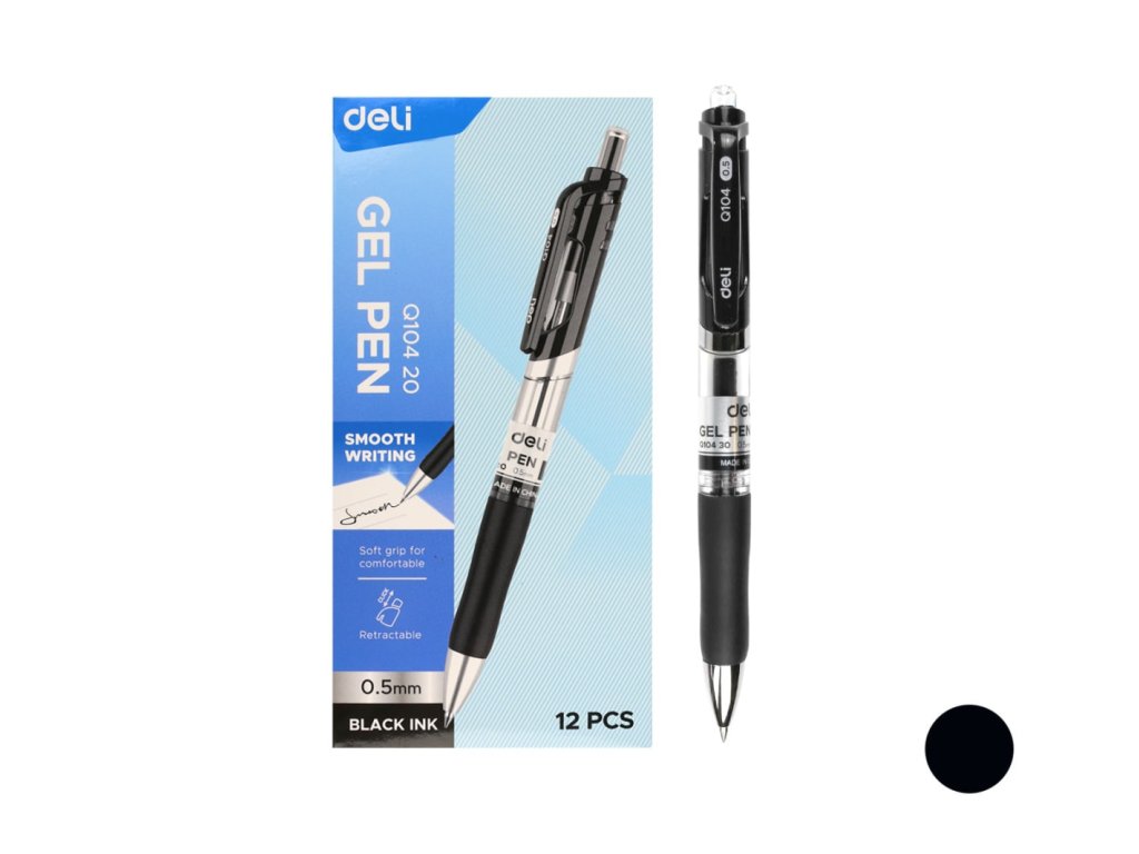 Propiska gelová DELI EQ10420 černá: - kuličkový hrot- šíře stopy: 0,5mm- barva náplně: černá- gelová náplň- hladké psaní- inkoust s nízkou viskozitou- stiskací mechanismus- měkký pogumovaný úchopDoplňkové parametry