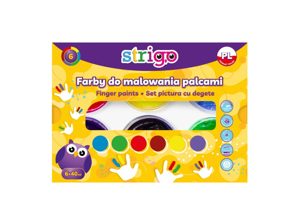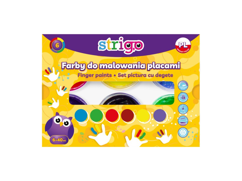 Velké prstové barvy v kelímku: červená, modrá, žlutá, černá, zelená a fialová.Doplňkové parametry