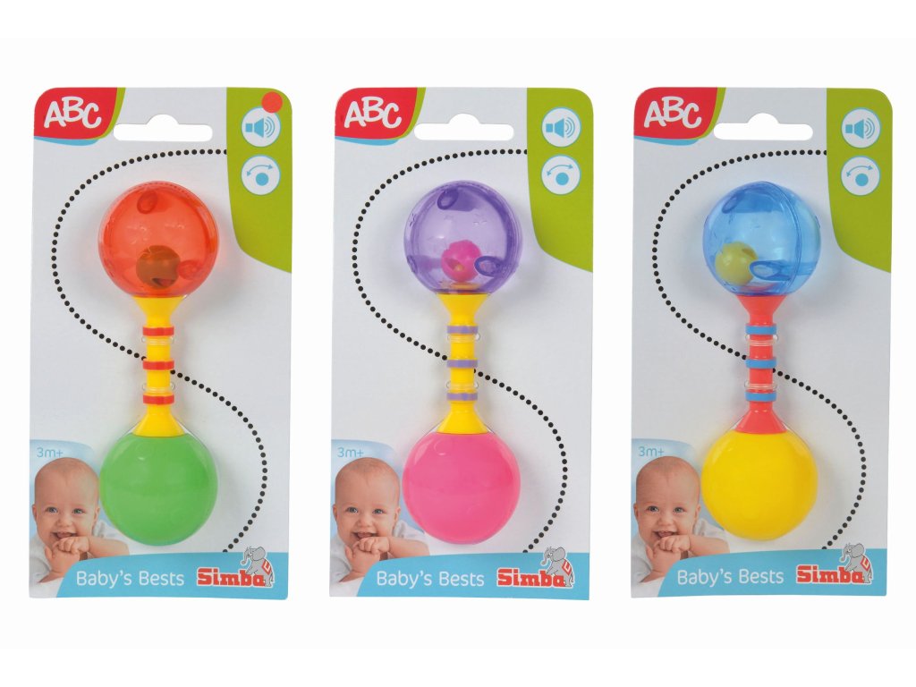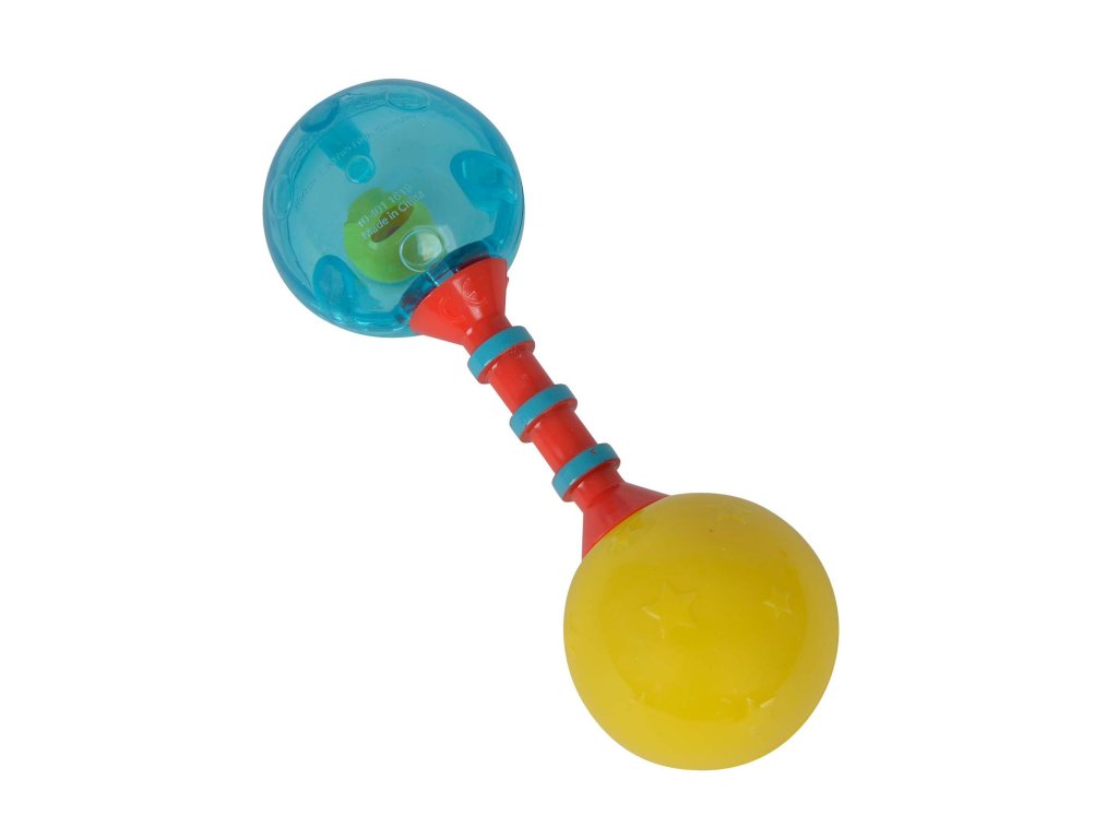 Veselé chrastítko ve tvaru činky. Jedna strana průhledná s barevnou kuličkou uvnitř. Velikost: 13,5 cm.Doplňkové parametry