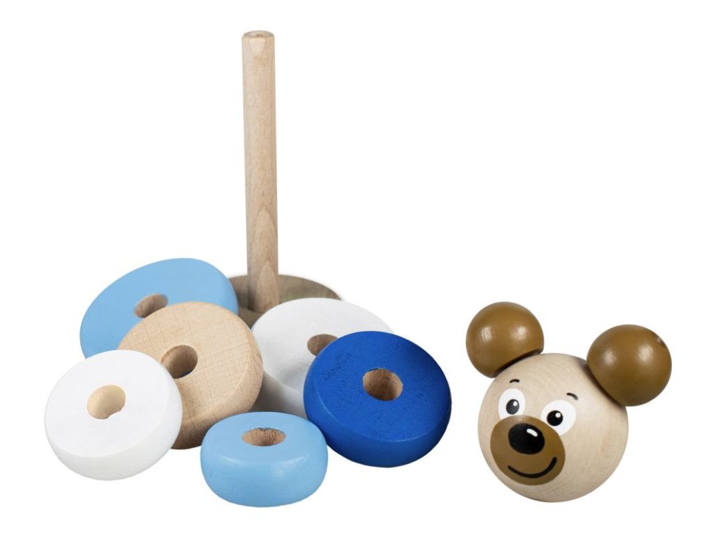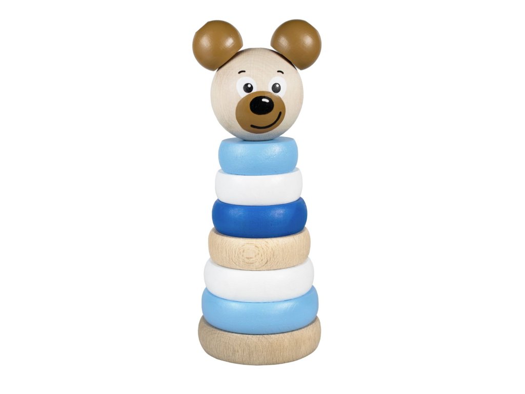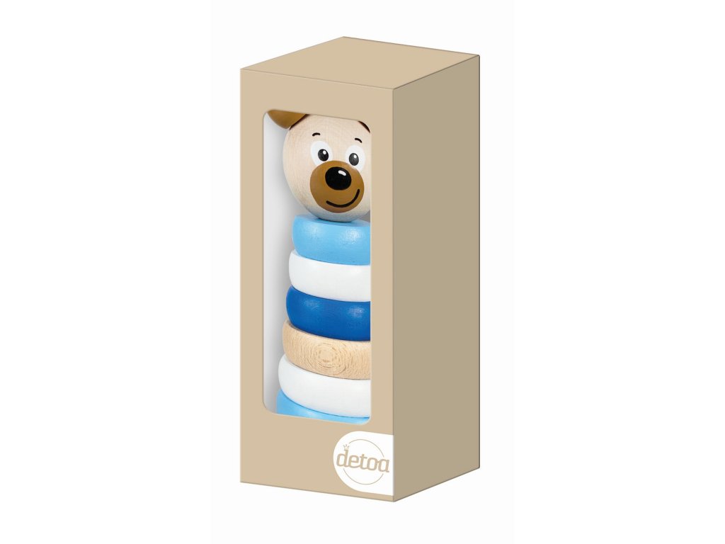 Dřevěná skládací pyramida s motivem medvídka rozvíjí představivost, logické myšlení a motorické schopnosti dítěte. V modré variantě. V EKO přírodním balení.Doplňkové parametry