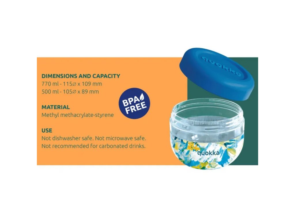 Luxusní plastová nádoba QUOKKA s protiskluzovým silikonovým povrchem a šroubovacím uzávěrem vás okouzlí svým designem. Je vhodná pro uskladnění ale i přenos potravin a tekutin. Je vyrobena z odlehčeného zdravotně nezávadného plastu, který je odolný vůči nárazu, nepřijímá žádné vůně ani chutě a snadno se udržuje.