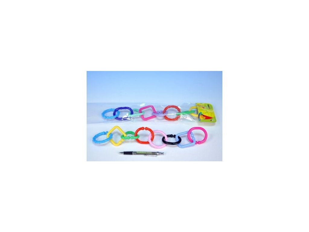 Plastový řetěz pro nejmenší. Řetěz je tvořen 8 dílky různých geometrických tvarů. Každý dílek má velikost 6 cm. Z jednotlivých částí je možné vytvořit krásný, různě dlouhý řetěz, přesně podle Vašich představ. Pestrobarevná hračka miminko okamžitě zaujme a zabaví na dlouhou dobu.Vhodné od narození.Doplňkové parametry