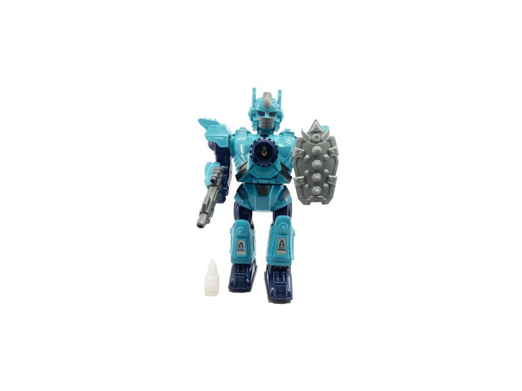 Robot Mecha s efekty páry modrý. Výška robota 32 cm. Vydává světelné a zvukové efekty. Nádržka na vodu je v horní části hrudníku. Balení obsahuje také štít a zbraň. Přihrádka na baterie v zadní části robota. 3xAA (1,5V), nejsou součástí.Doplňkové parametry