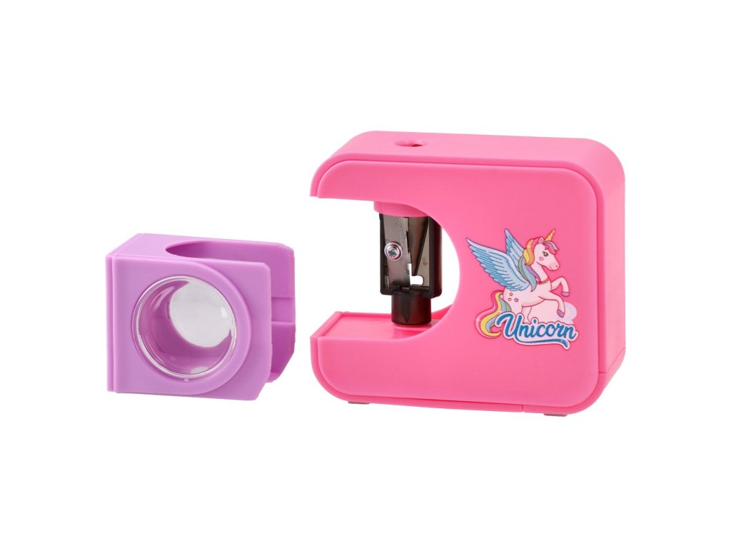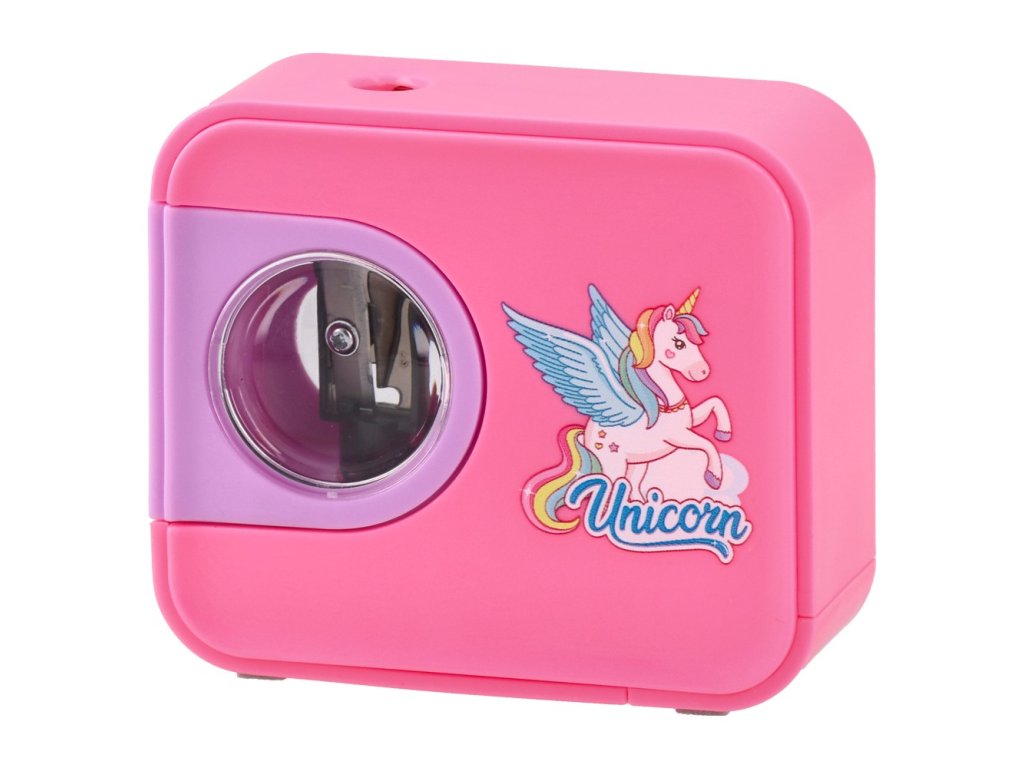 Ořezávač tužek a pastelek na baterie v dětském designu jednorožce.