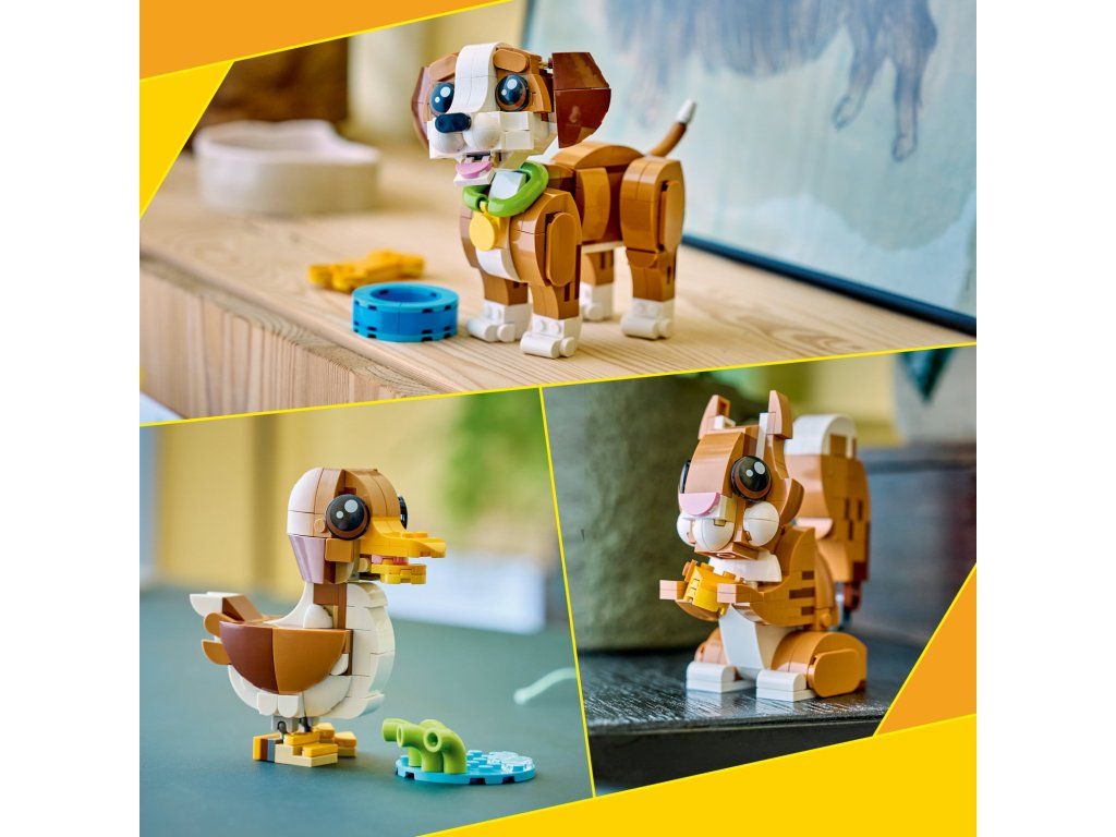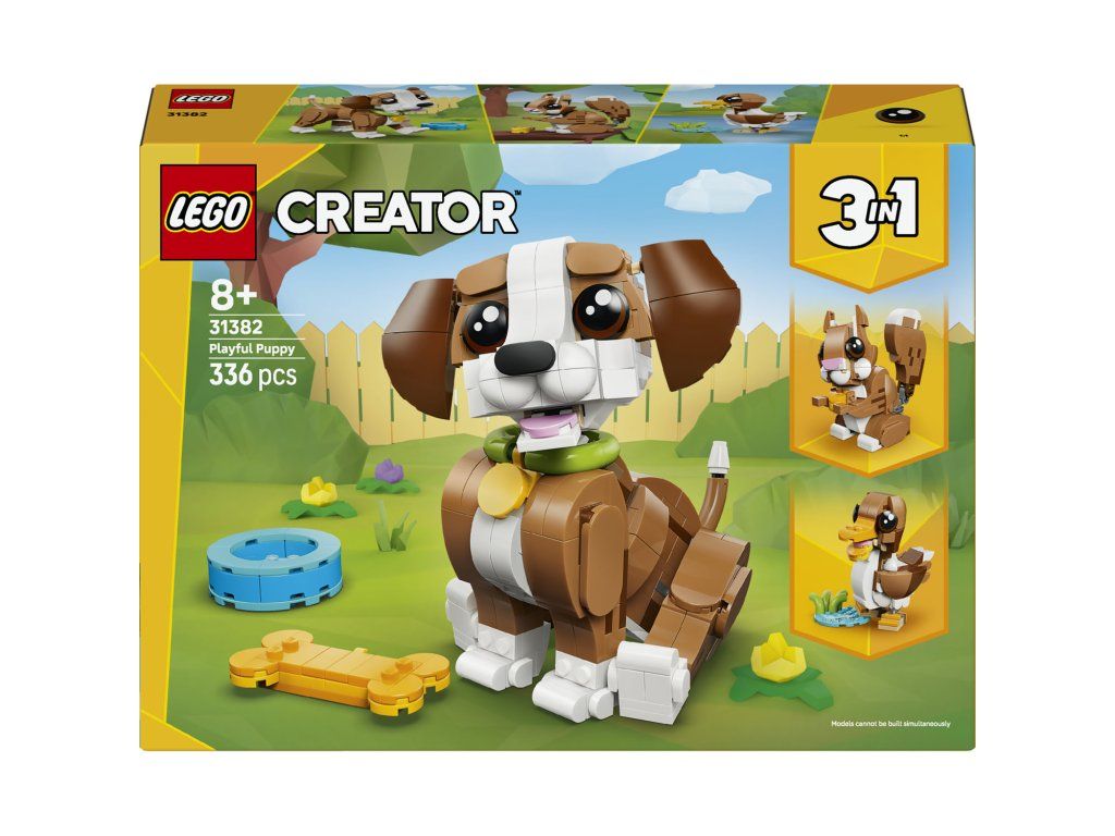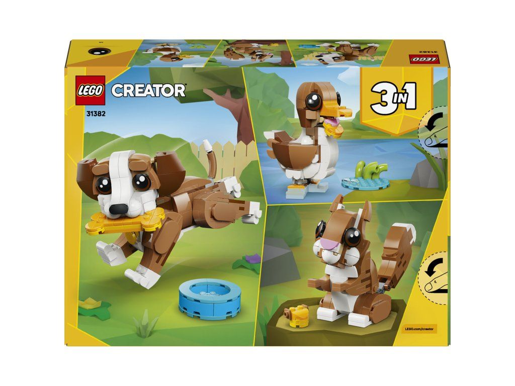 Se stavebnicí LEGO® Creator 3 v 1 Roztomilá zvířata: Roztomilé štěňátko (31382) si děti od 8 let užijí hru plnou zábavných příběhů. Tato roztomilá zvířecí hračka pro holky i kluky nabízí 3 různé možnosti stavění ze stejné sady kostek. Děti si můžou postavit hračku v podobě psa s pohyblivou hlavou, ušima, nohama, ocasem, obočím a tlamou, ke které patří obojek, hračka v podobě kostičky a miska na vodu. Tu pak přestaví na hračku v podobě veverky s pohyblivou hlavou a ocasem, která drží žalud, nebo na model kachny s pohyblivou hlavou a rybníčkem plným zeleně. Až si děti dohrají, jednotlivé modely si můžou hrdě vystavit. Tato stavebnice se zvířátky 3 v 1 podnítí dětskou fantazii a představuje roztomilý dárek pro holky a kluky, kteří rádi vytváří příběhy. Aplikace LEGO Builder dodává dětem při stavění jistotu – své modely mohou přibližovat a otáčet ve 3D, a sledovat postup pomocí srozumitelného digitálního návodu. Upozornění: Modely nelze sestavit najednou. Stavebnice obsahuje 336 dílků.Doplňkové parametry