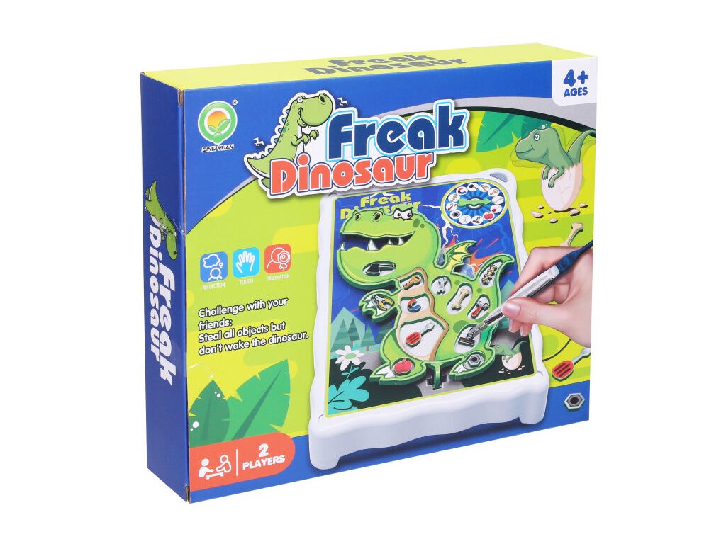 Rozzlobený dinosaurus hra. Velikost hrací tabulky je 18x3,5x15 cm. Obsah balení: hrací deska s pinzetou. 12 předmětů. 12 samolepek - aplikujte na jednotlivé předměty. Roztoč ruletu a snaž se vyjmout předmět z těla dinosaura pomocí pinzety, aniž bys ho rozzlobil. Při kontaktu pinzety s povrchem hrací desky se dinosaurus rozvibruje. 1 nebo 2 hráči. 3xAA nejsou součástí. Ve spodní části hrací plochy se nachází malá přihrádka pro uschování předmětů.Doplňkové parametry
