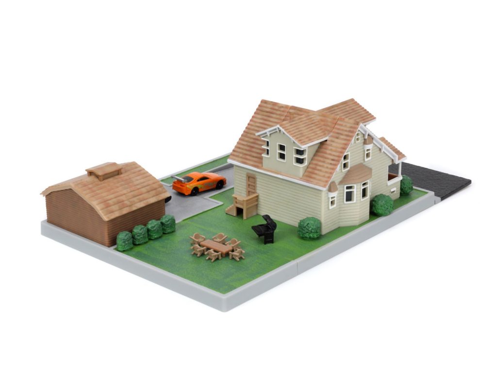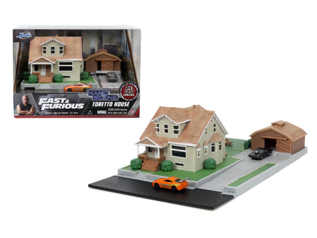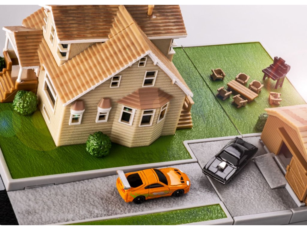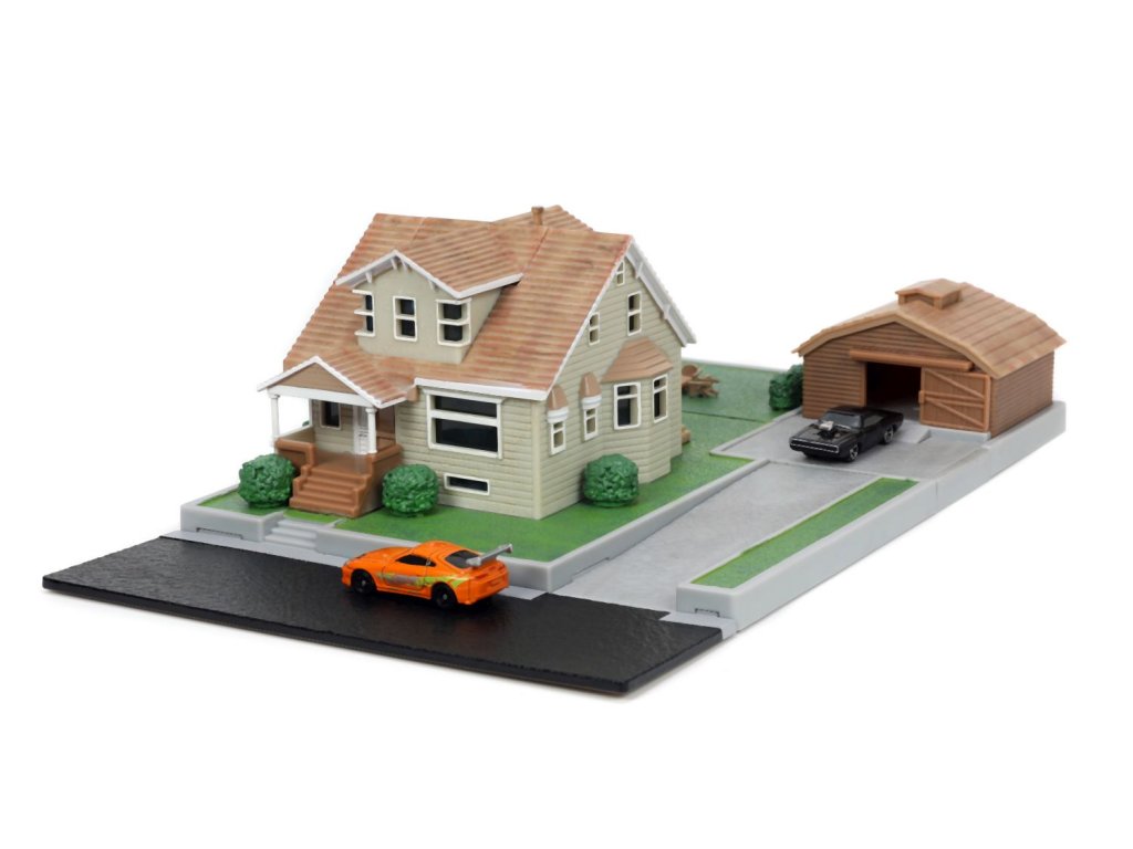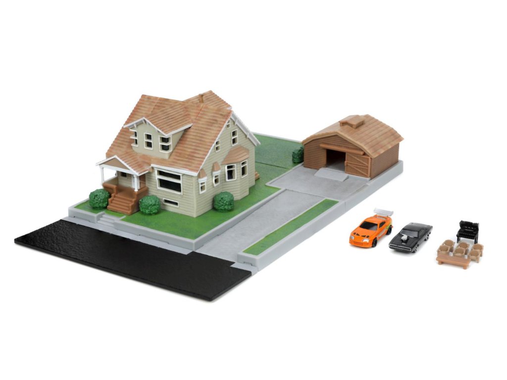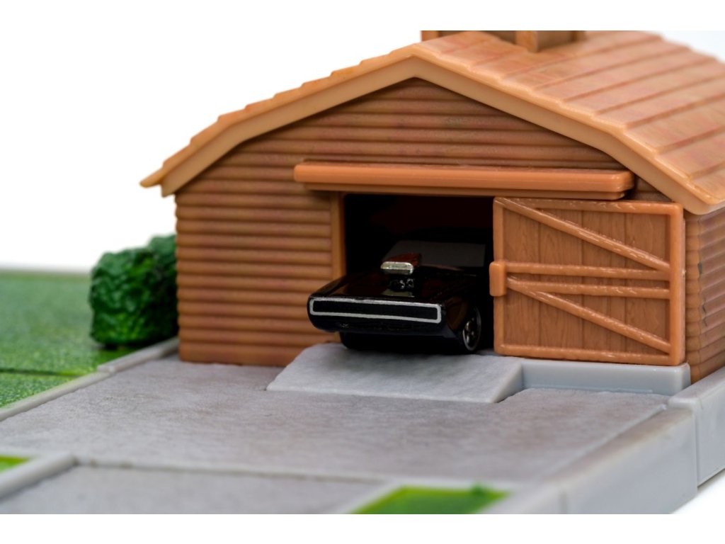 Diorama domu a zahrady Dominika Torrety z akčního filmu Rychle a zběsile Dominik s garáží. Součástí 2x kovová nanoauto na volnoběh (Dodge Charger a Toyota supra), mají otočná kola a gumové pneumatiky, zahradní gril a nábytek. Rozměry domu: 14 x 20 x 20 cm. Délka autíček 4 cm.Doplňkové parametry