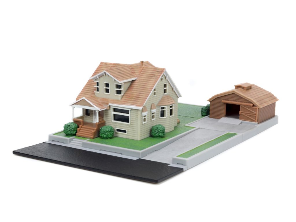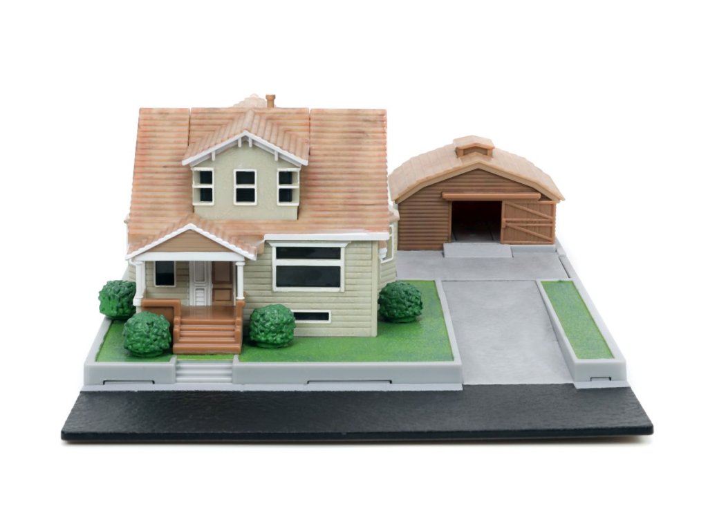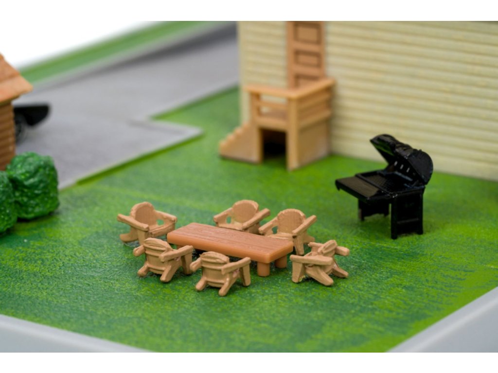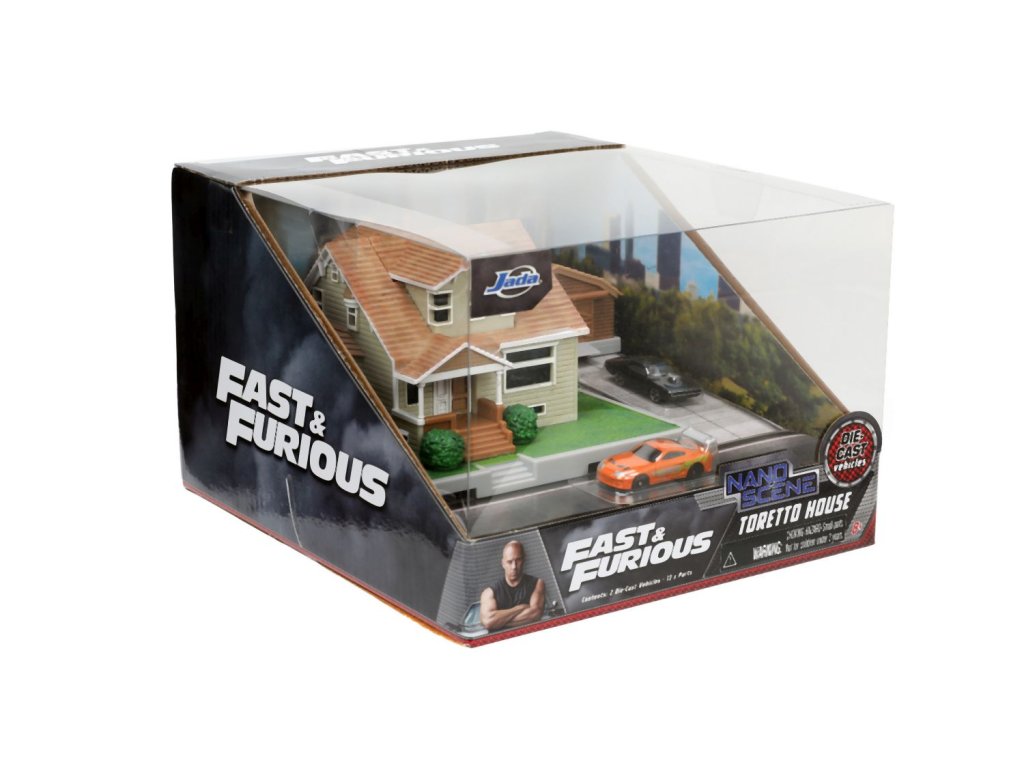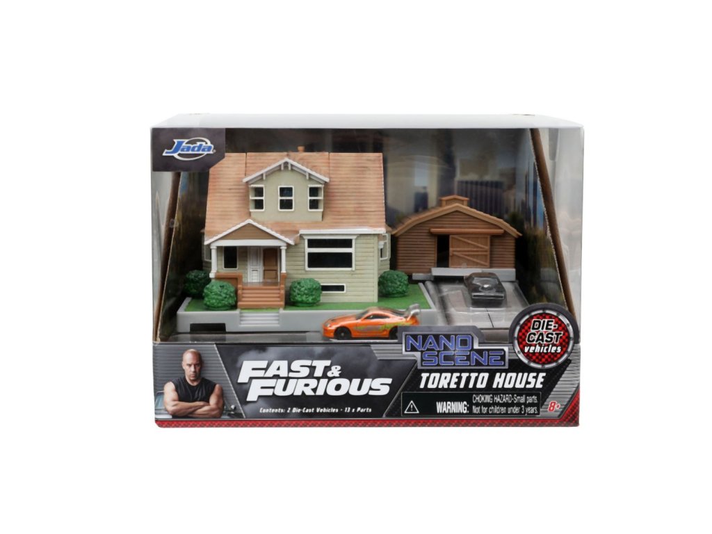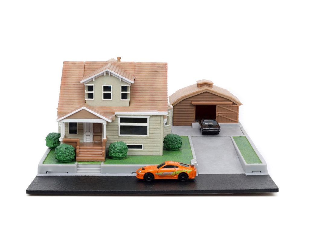 Diorama domu a zahrady Dominika Torrety z akčního filmu Rychle a zběsile Dominik s garáží. Součástí 2x kovová nanoauto na volnoběh (Dodge Charger a Toyota supra), mají otočná kola a gumové pneumatiky, zahradní gril a nábytek. Rozměry domu: 14 x 20 x 20 cm. Délka autíček 4 cm.Doplňkové parametry