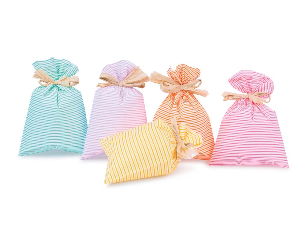 Celofanový sáček o velikosti 20x32 cm Design pruhy. 5 barevných provedení (žlutý, oranžový, růžový, fialový, zelený).Doplňkové parametry